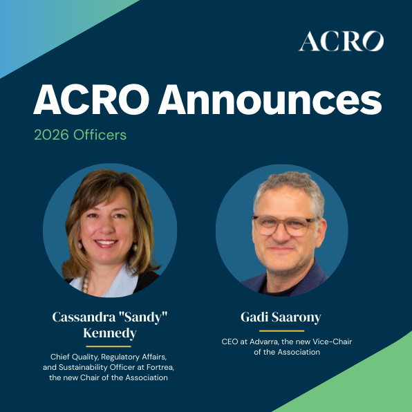 WASHINGTON, DC (December 10, 2025) – Today, ACRO announced that its Board of Directors elected Cassandra “Sandy” Kennedy, Chief Quality, Regulatory Affairs, and Sustainability Officer at Fortrea, as Chair of the Association, effective January 1, 2026. Gadi Saarony, Chief Executive Officer at Advarra, was elected Vice-Chair of the Association. In addition, the Board of Directors elected Marco Capasso, Chief Legal and Risk Officer at Advarra, as Secretary of the Association, and Ari Feldman, Senior Vice President, Global Compliance and Strategy at Medidata Solutions, as Treasurer.