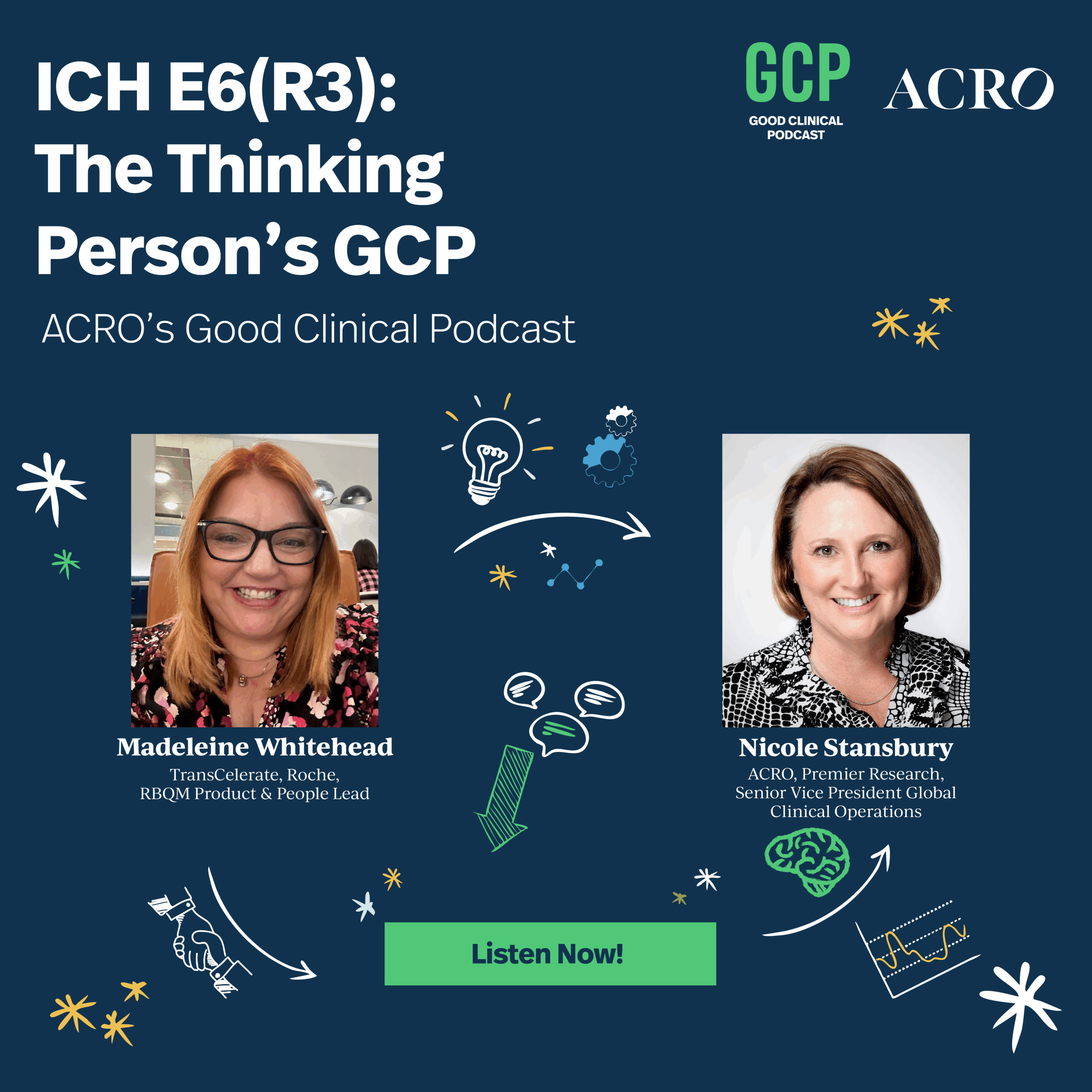 On this episode of ACRO’s Good Clinical Podcast, Nicole Stansbury (SVP, Global Clinical Operations, Premier Research) and Madeleine Whitehead (RBQM Product & People Lead, Roche) join the podcast to discuss ACRO’s collaboration with TransCelerate BioPharma, Inc., the impact that ICH E6(R3) will have on Good Clinical Practice, and implications for innovation.