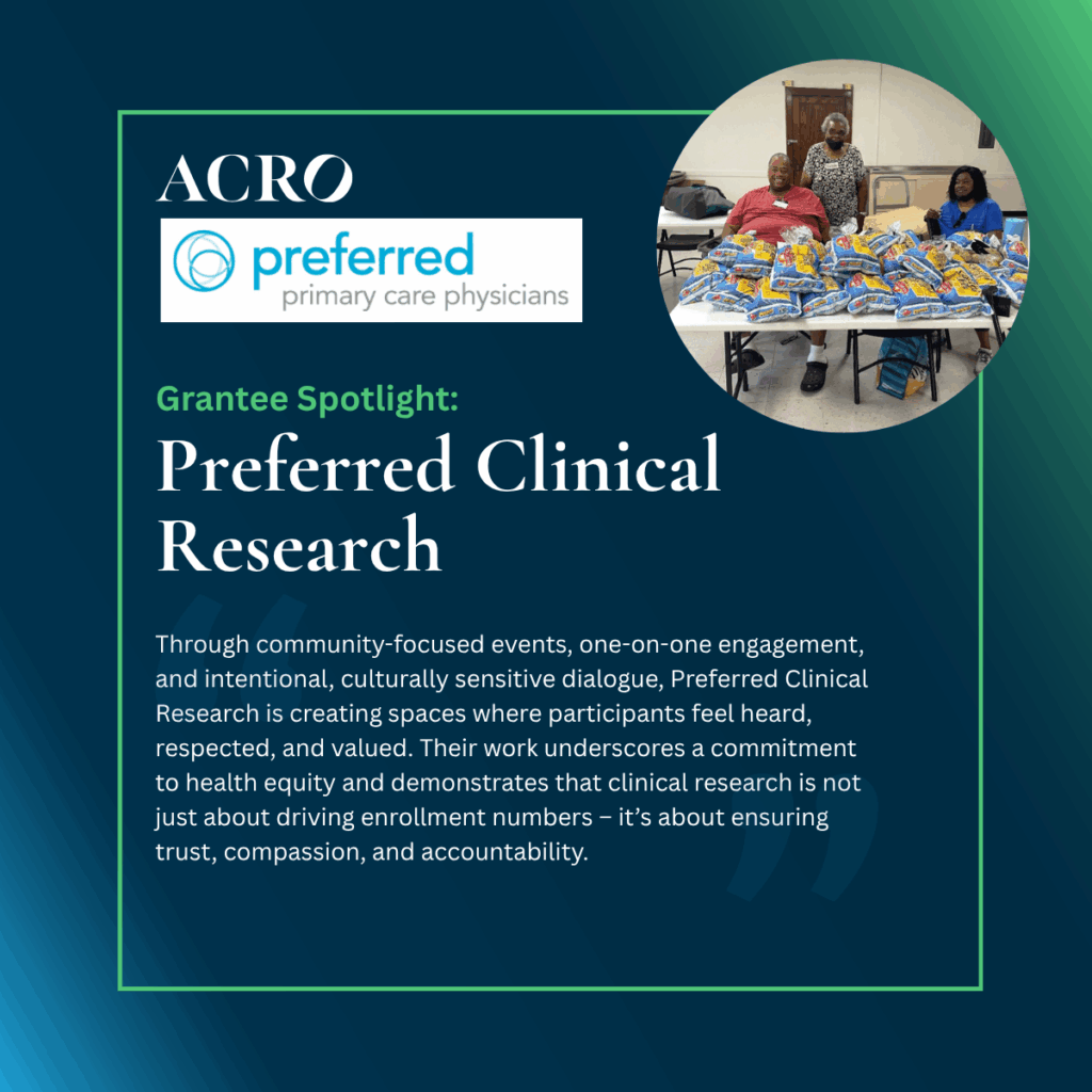 Within the Clairton, Pennsylvania community, Preferred Clinical Research’s team is reshaping how underrepresented populations engage with and experience clinical research. With support from an ACRO Site Resource Grant, their project focuses on utilizing a community outreach liaison to lead efforts that aim to build enduring trust, improve access, and foster meaningful connections between community participants and healthcare providers.